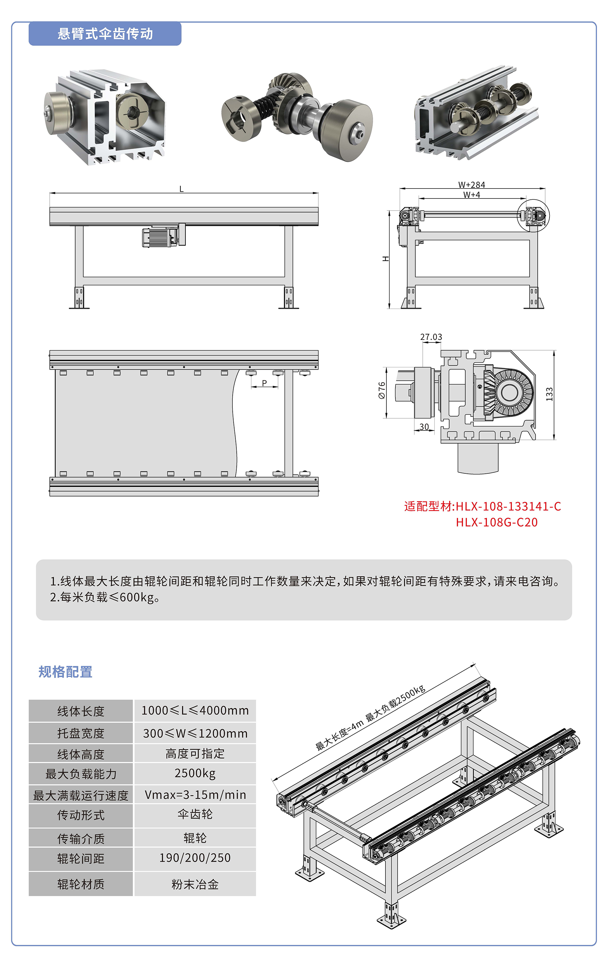 采用133141铝型材,伞齿驱动,粉末冶金滚轮镶嵌铜套实现积放功能,负载2500kg/米,最大负载速度15M/min, 轮距190、200、250可选,适用托盘宽度300-1200mm,线体长度范围1000-4000mm, 高度根据需求定制.