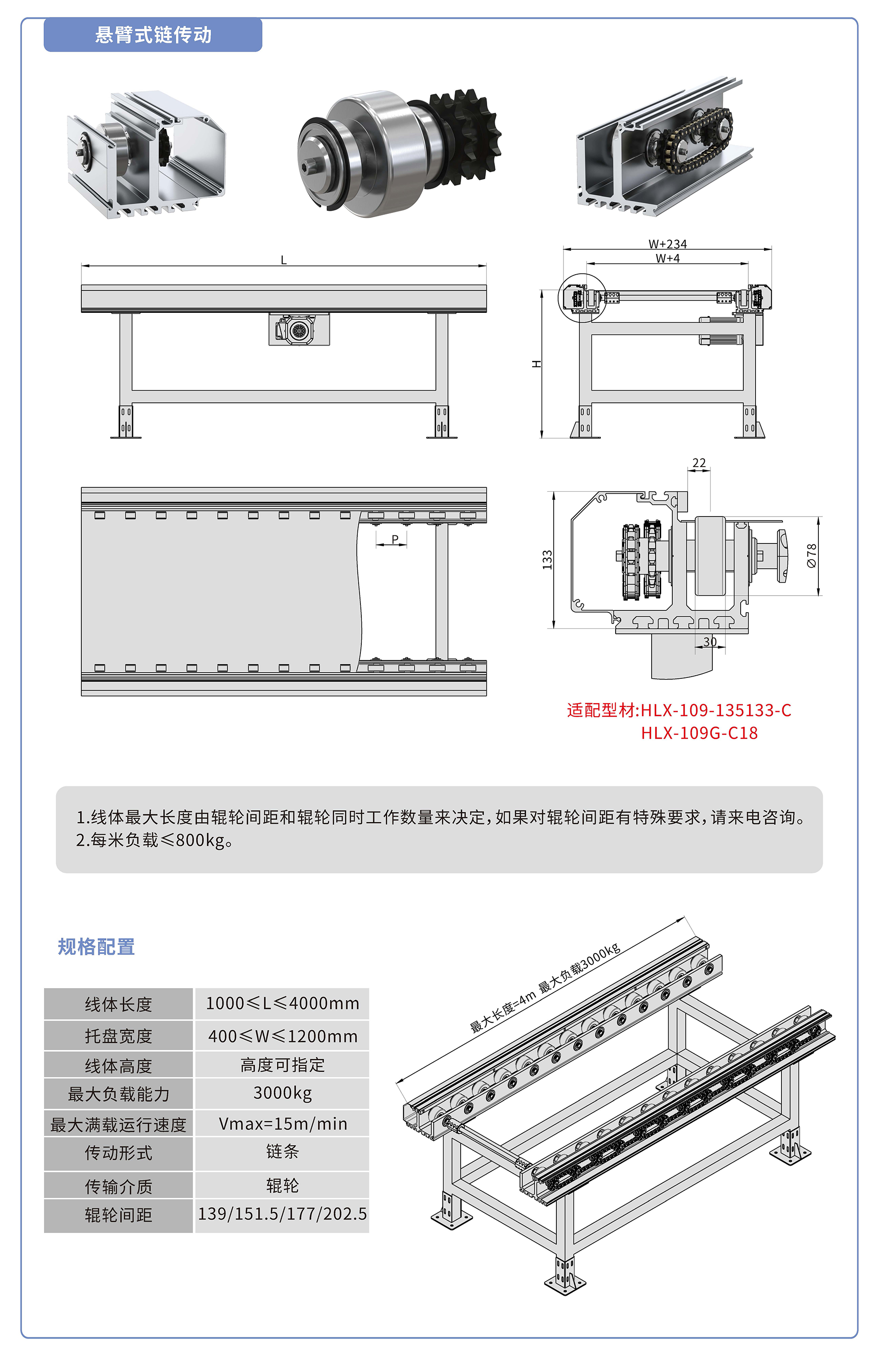采用135133铝型材,链轮传动,镀铬滚轮镶嵌铜套实现积放功能,负载3000kg/米,最大负载速度15M/min, 轮距139、151.5、177、202.5可选,适用托盘宽度400-1200mm,线体长度范围1000-4000mm, 高度根据需求定制.
