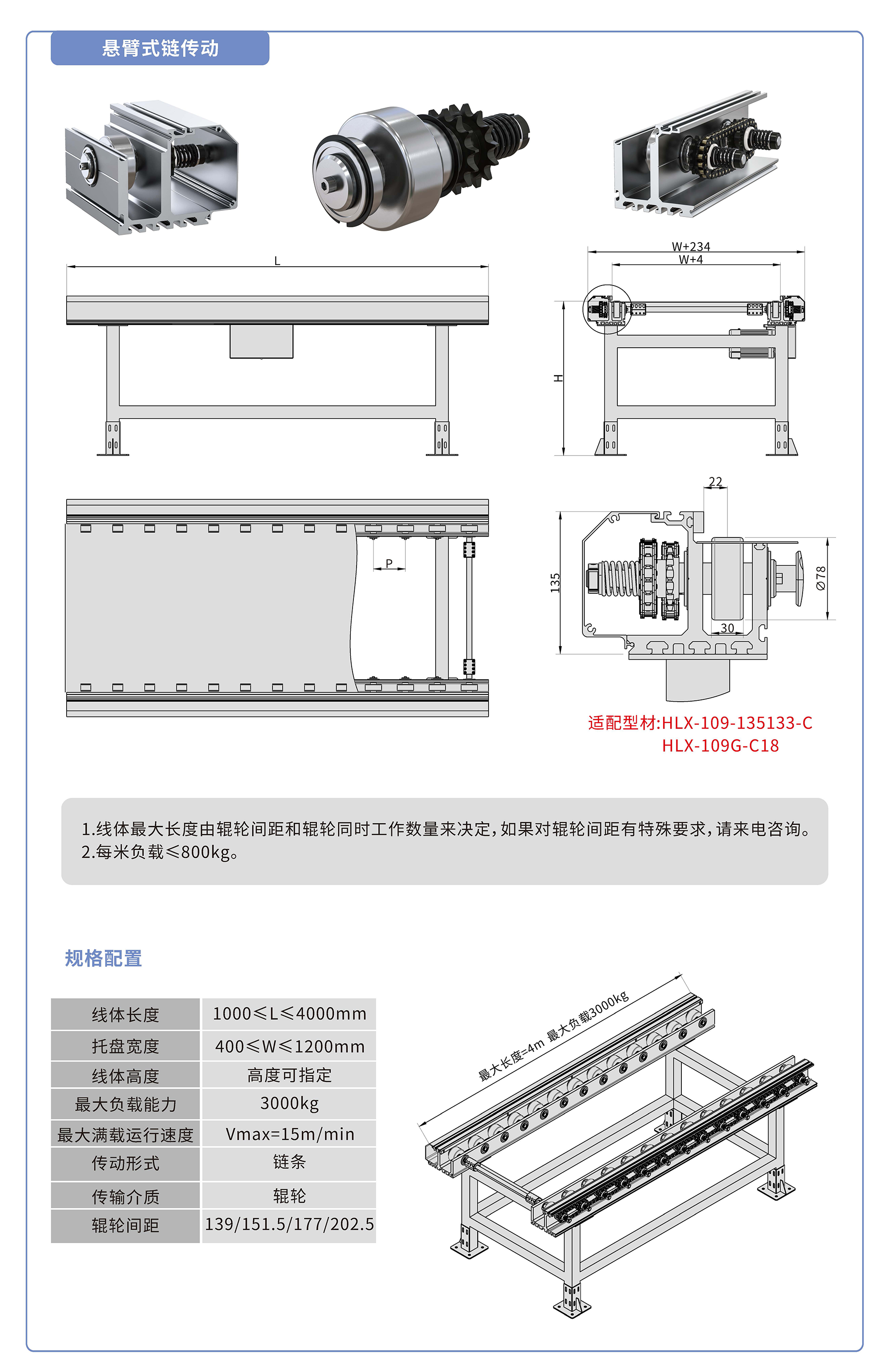 采用135133铝型材,链轮传动,镀铬滚轮镶嵌铜套实现积放功能,负载3000kg/米,最大负载速度15M/min, 轮距139、151.5、177、202.5可选,适用托盘宽度400-1200mm,线体长度范围1000-4000mm, 高度根据需求定制.