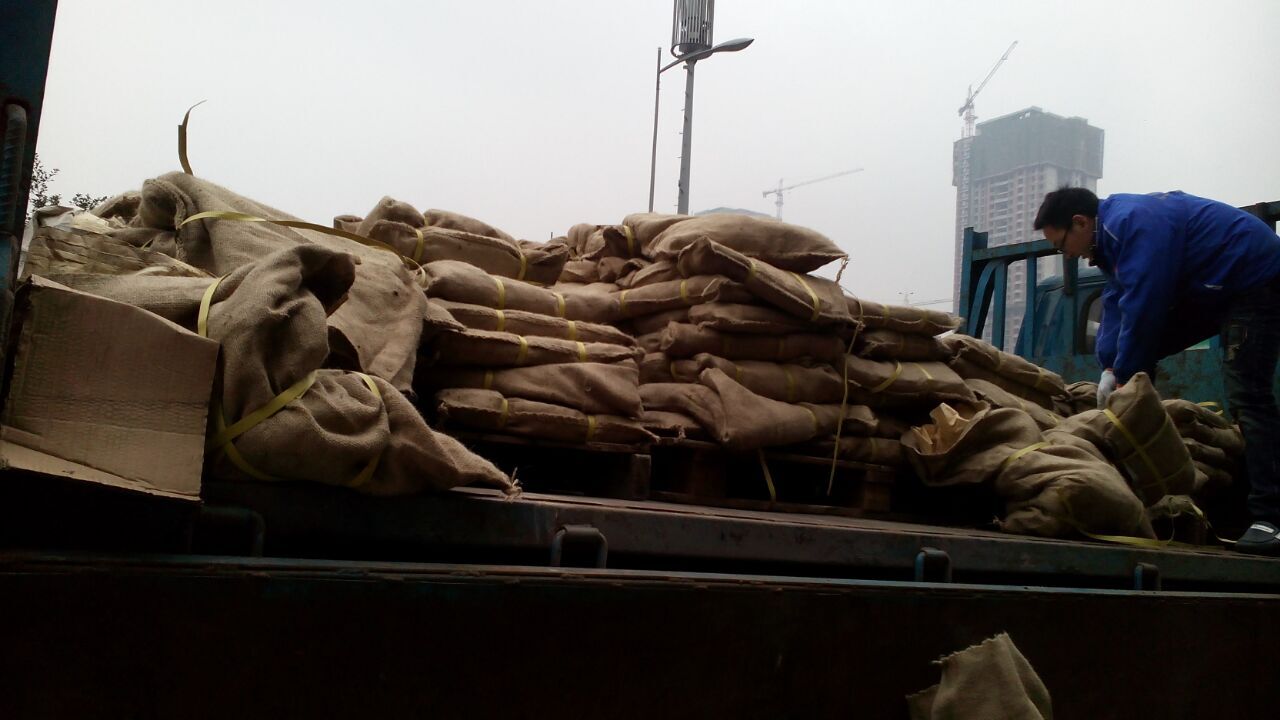 由于仓库条件有限,不能使用叉车,伙伴们徒手将一袋袋沉重的链条抱进仓库。