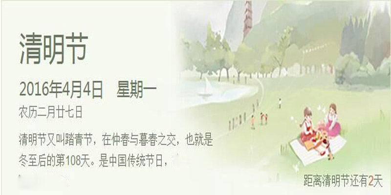 清明节即将来临,根据国务院办公厅关于2016年节假日放假安排,结合我司实际情况现将清明节放假安排如下: 放假共计2天,4月3日至4月4日,4月5日(星期二)正常上班。给您带来的不便,敬请谅解! 若有紧急事务请联系:蒲经理(15215047772) 张经理(13637756600)