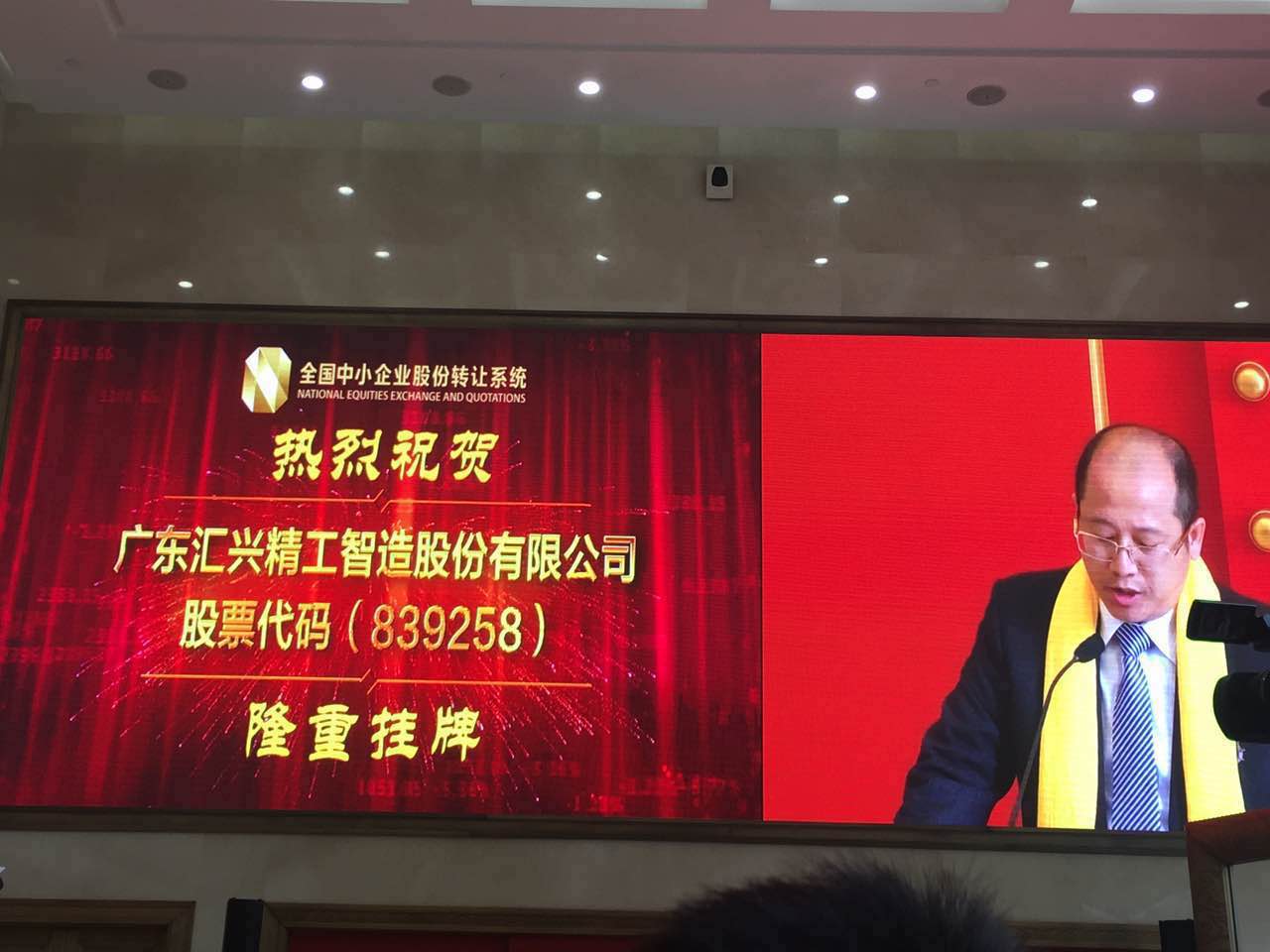 2016年11月1日上午10点,广东汇兴精工智造股份有限公司(股票代码:839258)以下简称汇兴智造,在全国中小企业股份转让系统仪式大厅隆重举行挂牌上市仪式。参加此次挂牌事宜内部嘉宾主要代表有钟辉董事长、昆山公司钟世鑫总经理、重庆公司胡伟路总经理、李福生总经理、吕常垣总经理、邓高全总监等董监高10余人。由钟辉董事长代表发言及敲钟仪式。成为了中国资本市场上首家以“精工智造股份有限公司”名称挂牌上市的企业。