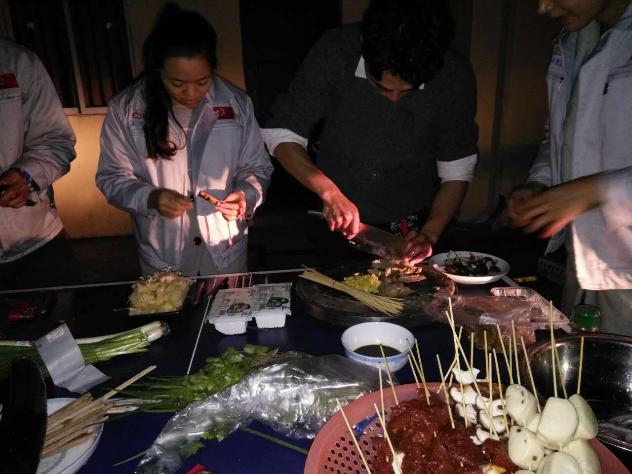大家默契十足、分工合作,一个洗菜一个切菜、一个烧烤一个添加调料