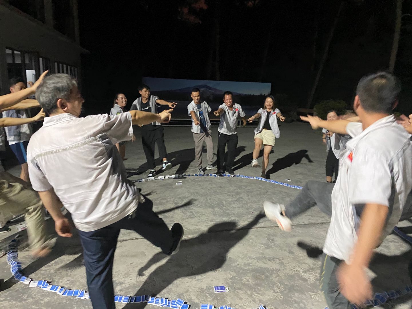 第二轮游戏-叠扑克牌,通过游戏来考验队长的指挥能力及队员的坚持、沟通能力。20盒扑克牌分别由AB两队,在规定的时间叠成一个圆,看谁速度更快。倒了再叠、叠了再倒.....坚持不放弃的画面在当晚的时刻里出现无数次,一次次相互加油、鼓劲的呐喊声印刻在每位成员的脑海中,相信通过这次游戏的锻炼大家在今后的日常工作中也会更加主动积极完成任务同时也更加具有坚韧力;最后在两队激烈的比拼下,B组团队顺利取胜。同时游戏输掉的一方A组,也将面临严格的惩罚,一起品尝人生象牙塔-酸、甜、苦、辣、咸。