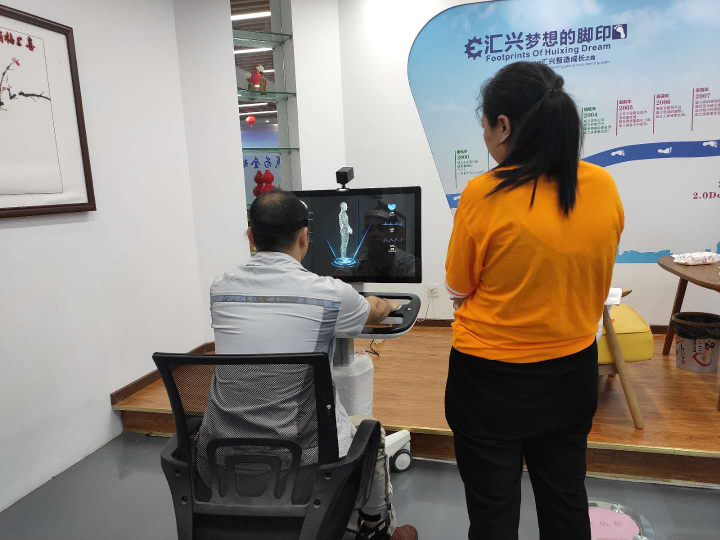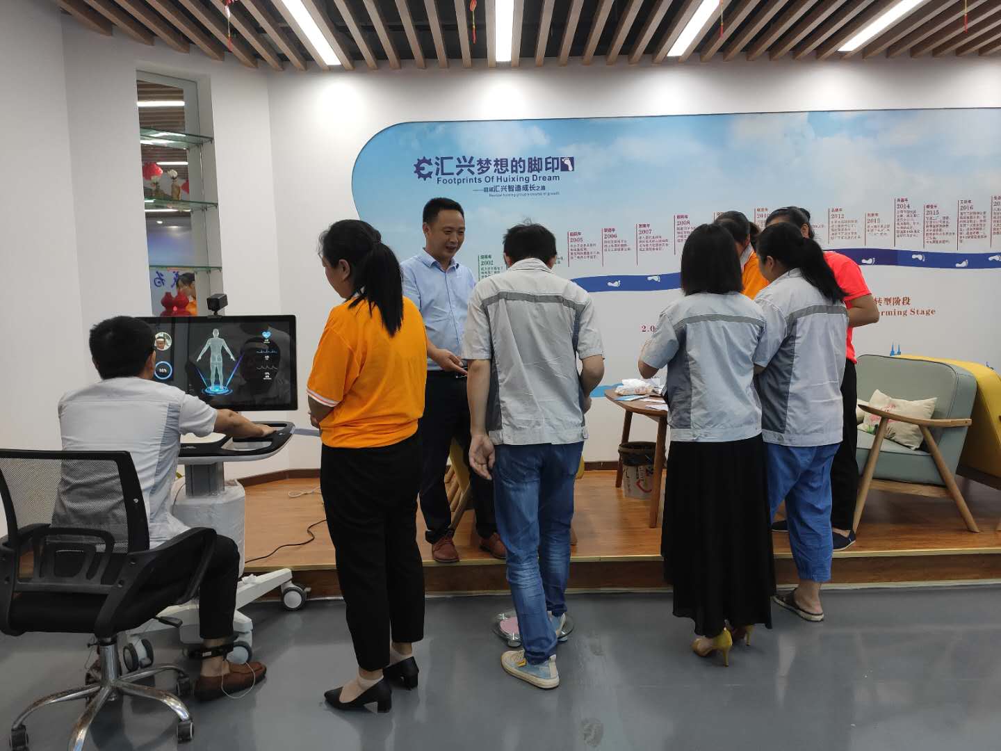 智能体检+机器人在“不抽血、不化验”的情况下,只需将“双手覆盖手掌传感器上的电极片,面部正对摄像头”,用两分钟的时间就能检测出70多种身体健康;既方便又快捷,并有效节约了大家的时间,充分达到了“早诊断、早预防、早治疗”的目的,让员工们以健康的身体投入到各项工作之中。