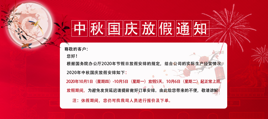 根据国务院办公厅2020年节假日放假安排的规定,结合公司的实际生产经营情况,2020年中秋国庆放假安排如下: