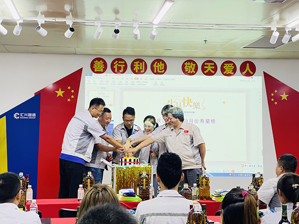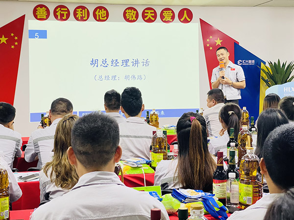 与时光握手,与岁月言和。成长不期而遇,用真切的祝福拉开寿星们的生日会,不仅让寿星们的生日过得更有意义,也使每一位员工都能切身的感受到公司的温暖和领导的用心,也让每个人所经历的平凡岁月里,都可以连续发生不一样的惊喜。再次祝福寿星们生日快乐! 会议第五项,胡伟路总经理讲话。首先胡总经理感叹时光飞逝,岁月如梭,蓦然回首,已到初秋之际,2021年仅剩下仅有的100多天,在这攻坚的三月里,全体员工仍需拿出“红军不怕远征难 万水千山只等闲”的民族气概,朝着我们的目标拿出我们的士气卯足劲儿的向前冲;其二、胡总经理向全体员工展示公司中秋礼品并解析礼品寓意(柴、米、油、盐、酱、醋、茶),以生活中不可缺之的物品让全体员工深刻感受到公司的关怀和关爱,并从侧面宣导全体员工在工作岗位中,对待同事要有温度,对待工作要有态度;花若盛开,蝴蝶自来,你若精彩,上天自会安排;其三、通过一则短视频向全体员工宣导反哺之恩 、舐犊之情,进一步勉励全体员工要有一颗感恩的心,感恩身边的人;其四、创立梦想基金,鼓励员工加大产值赋能,为公司为个人谋福利;同时也进一步勉励全体员工,“宝剑锋从磨砺出,梅花香自苦寒来”,只要我们一起努力,相信我们一定会实现我们的目标,让我们一起撸起袖子加油干!